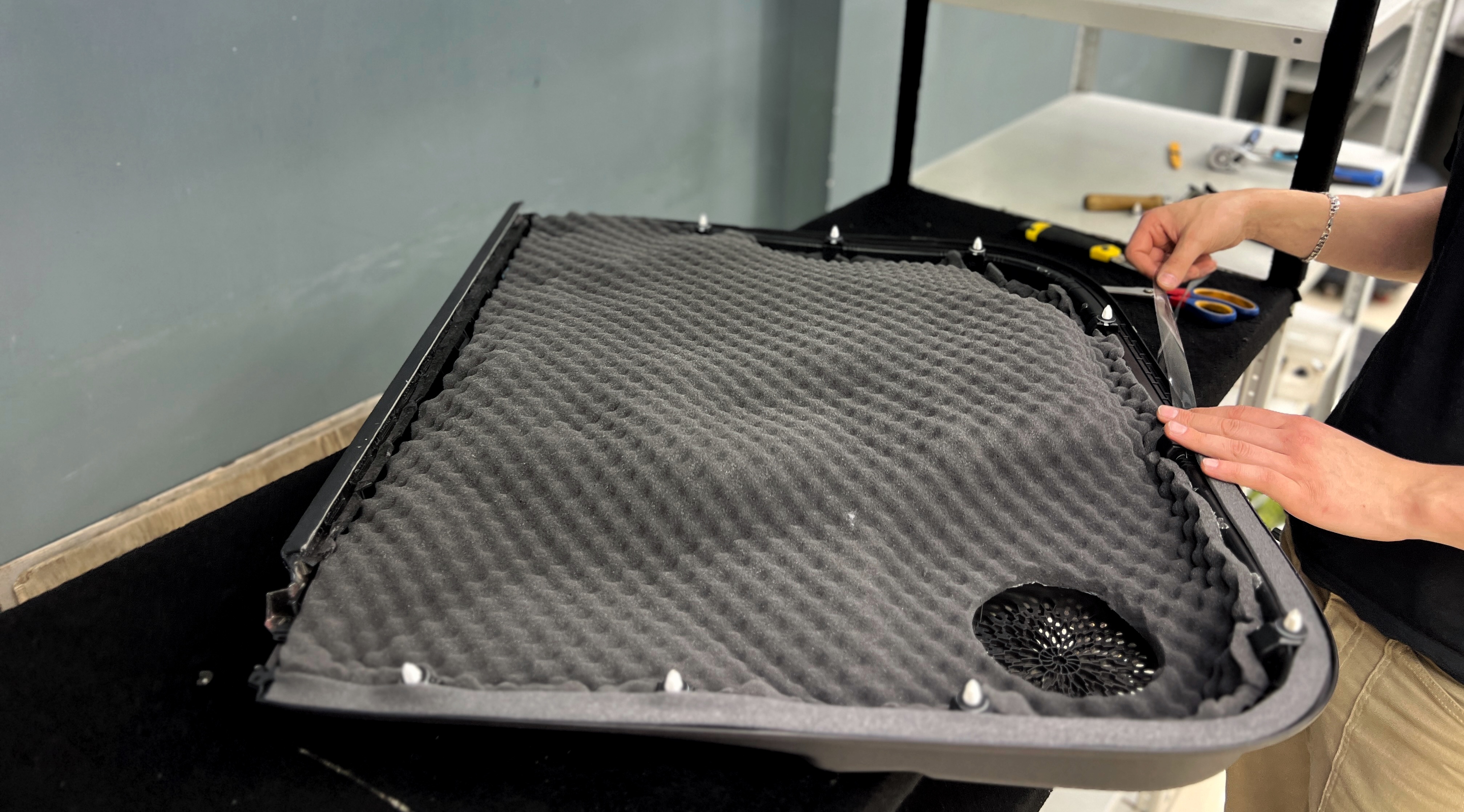 Внутренняя поверхность обивки оклеивается шумопоглотителем Шумофф Flex А15.