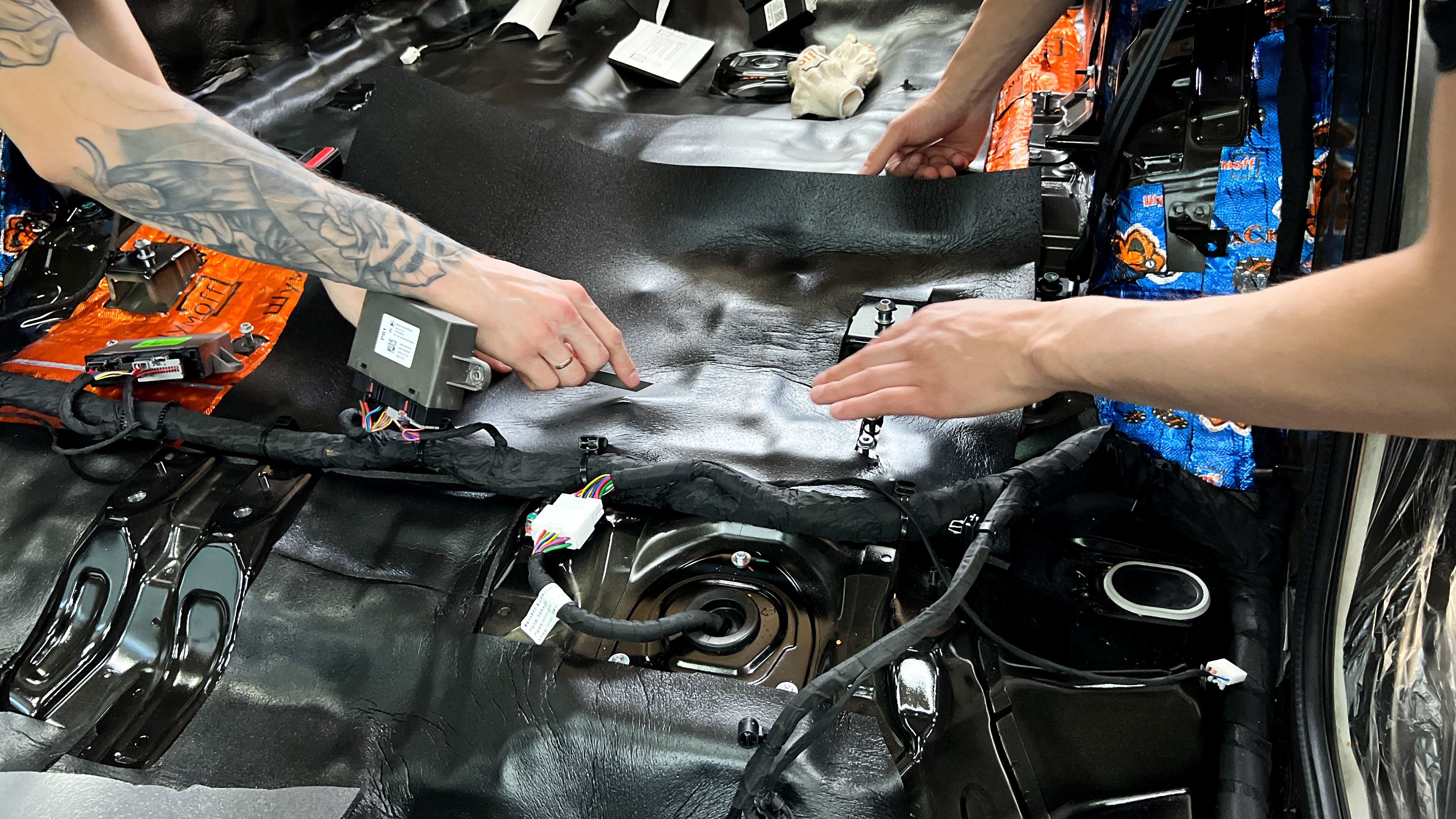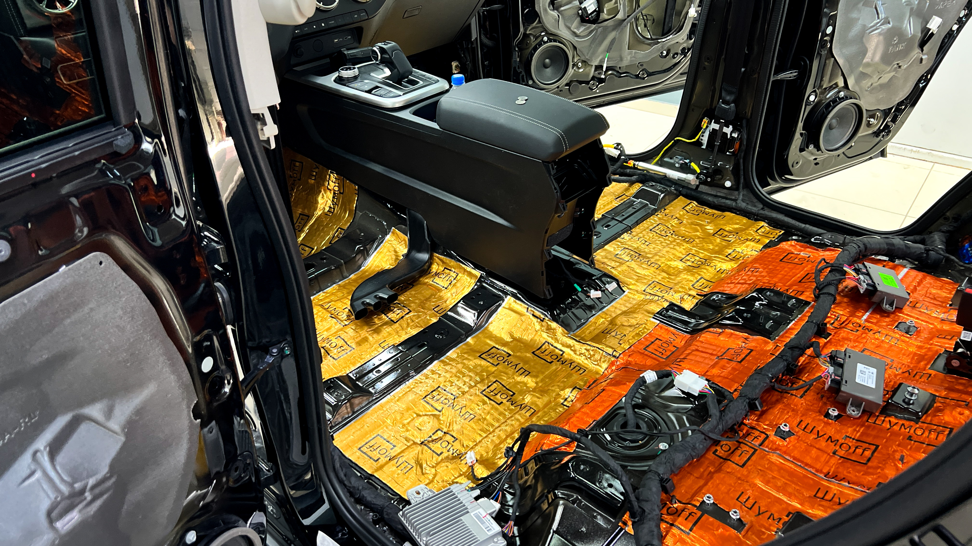 От моторной перегородки и до заднего сиденья вмести с ним клеится мощный многослойный шумо и звукоизолятор Шумофф Prizma 6.