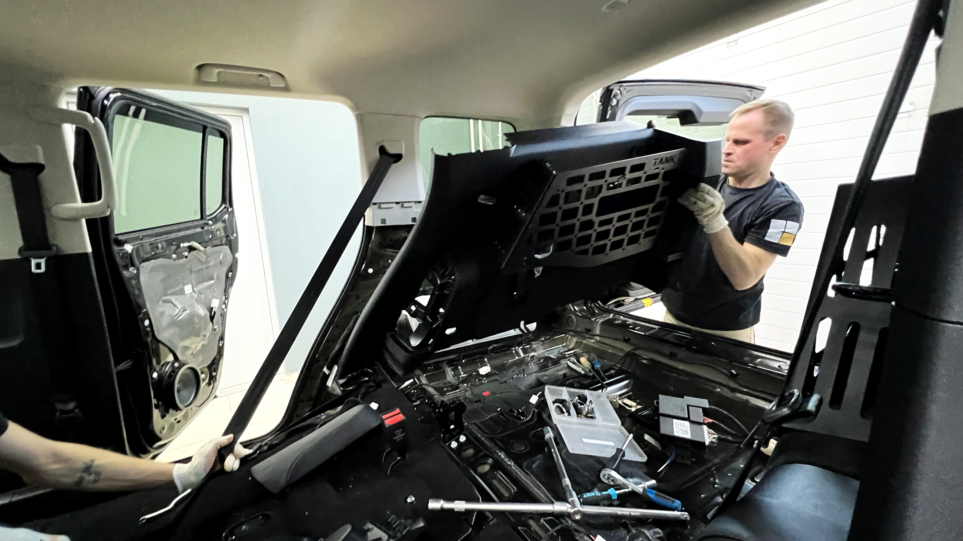 Для шумоизоляции багажника Tank 300 (Танк 300) будем использовать два материала: - самый вибронагруженный участок такой как арки оклеиваем Шумофф М4; - все дно багажника и крылья оклеиваем мене толстым и тяжелым Шумофф М3. Данная компоновка материалов для багажника позволит излишне не утяжелять кузов при достижении максимальной эффективности. Далее все дно и арки оклеиваем шумопоглотителем Шумофф Герметон 7л. На крылья вторым слоем клеим более толстый рельефный шумопоглотитель Absorber А15. Завершаем шумоизоляцию нанесением третьего слоя звукоизоляционной мембраны Practik Finish на арки. В результате получаем компоновку материалов с максимальной эффективностью и возможностью сборки салона в первозданный вид.