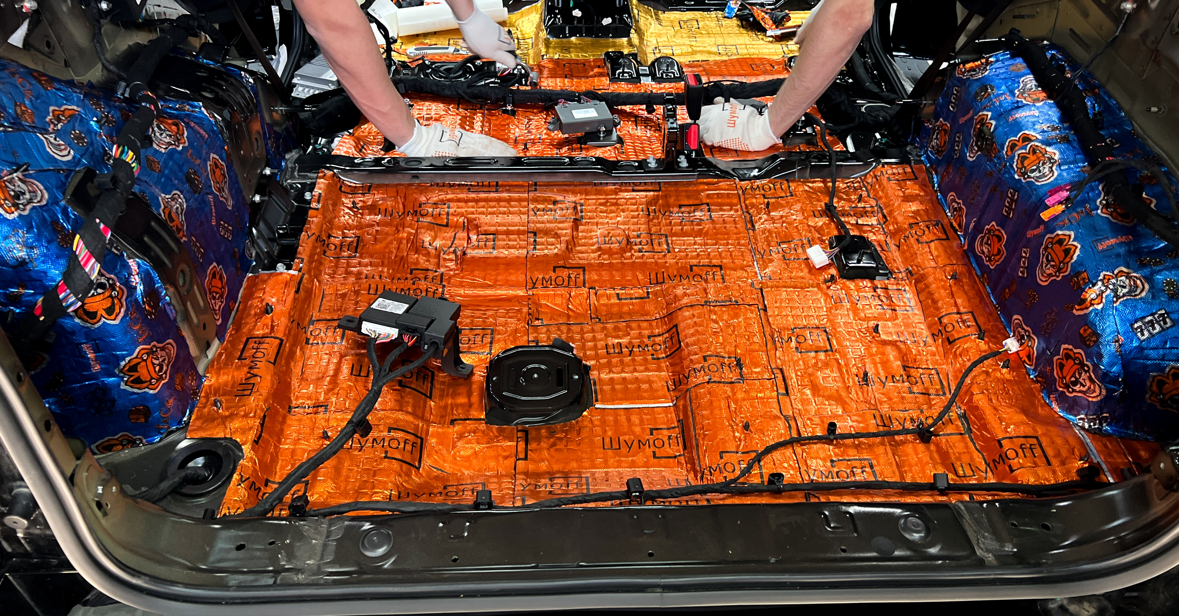 Дно багажника и крылья оклеиваются шумо и теплоизолятором Шумофф П4 4. Арки оклеиваются шумопоглотителем Flex A15.