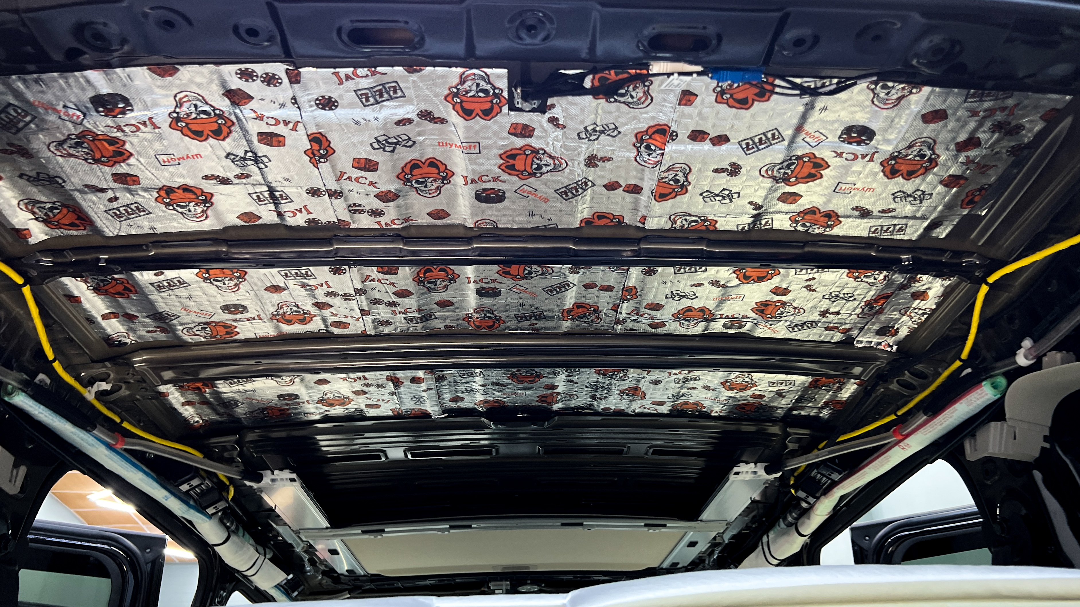 Штатная шумоизоляция крыши на Honda CR-V (Хонда СР-В) полностью отсутствует. Обезжириваем поверхность для начала монтажа виброизоляции. В качестве первого слоя используем виброизоляцию Шумофф Jack. Тщательно прикатываем каждый приклеенный лист.