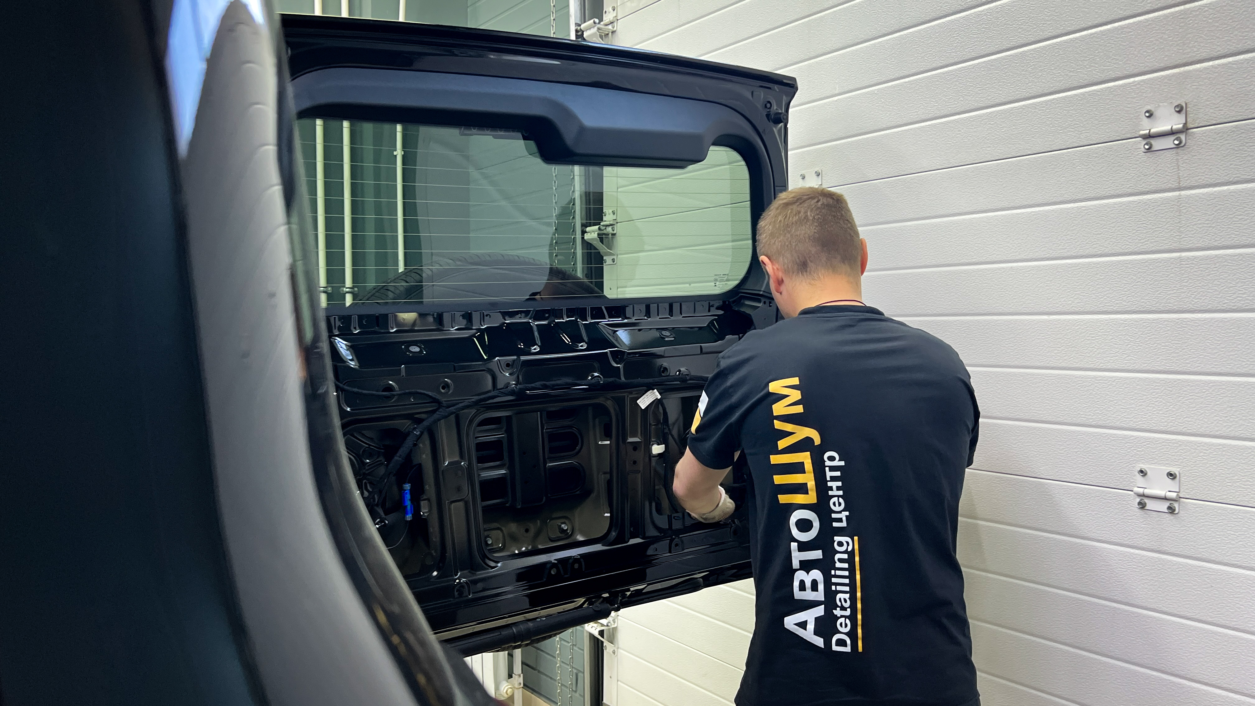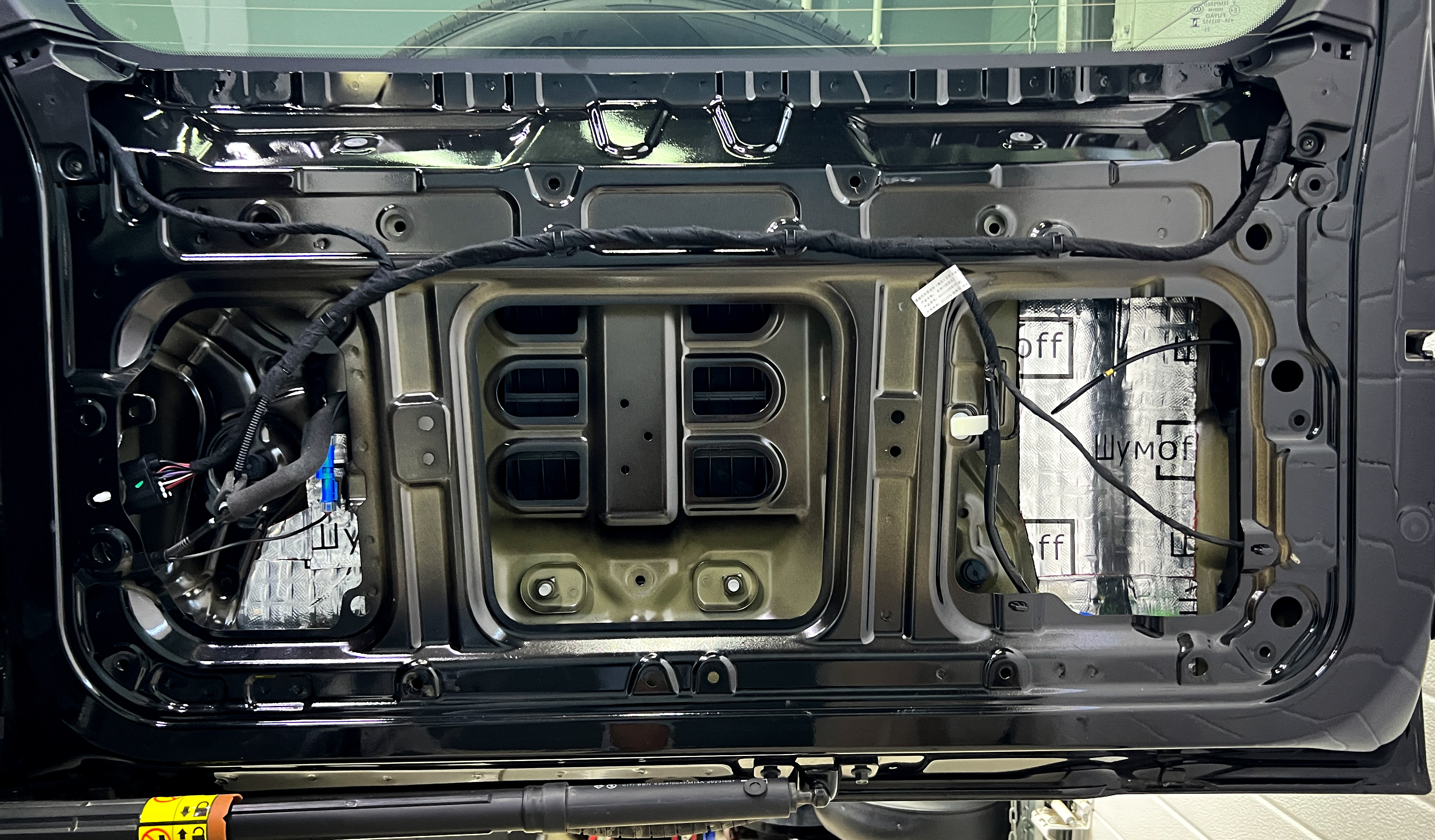 Заднюю дверь багажника оклеиваем виброизоляцией Шумофф L2, это позволит свести увеличение ее веса к минимуму, дабы не возникло проблем с открыванием багажника.