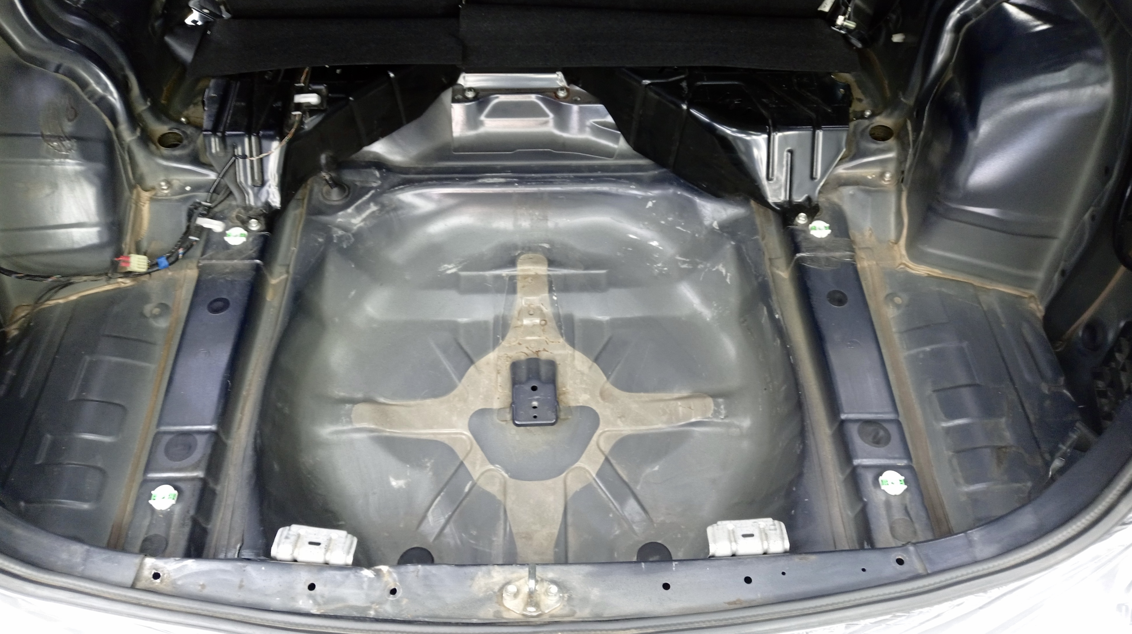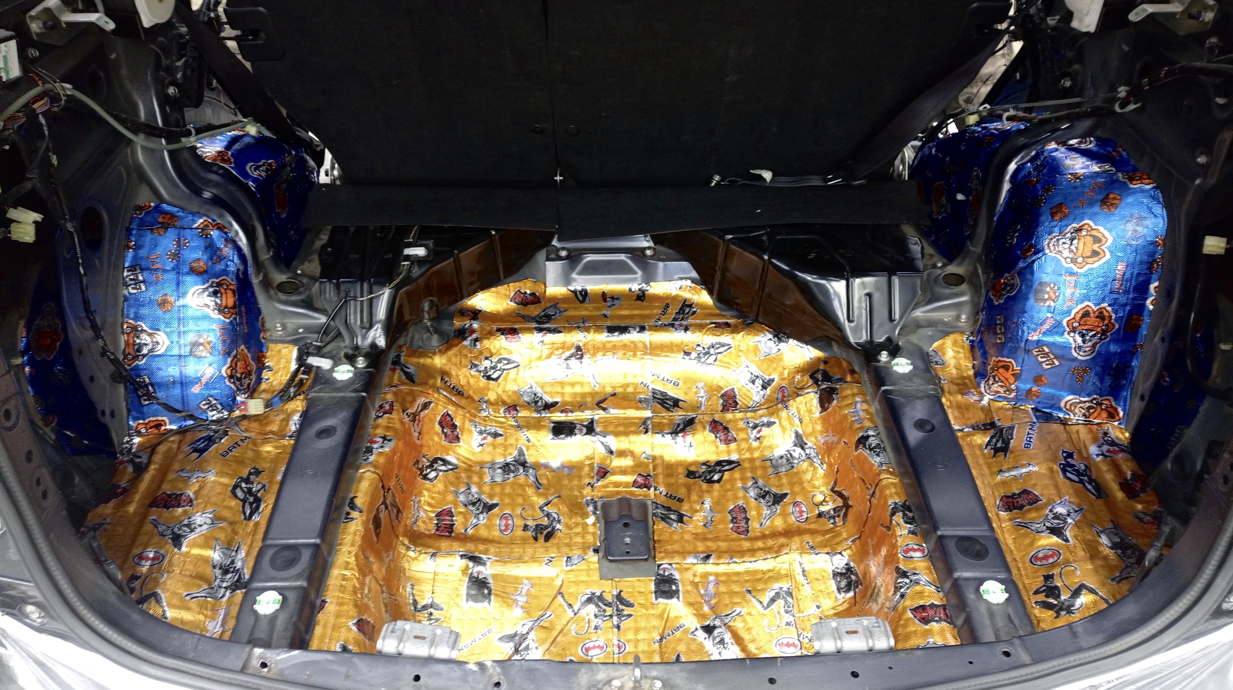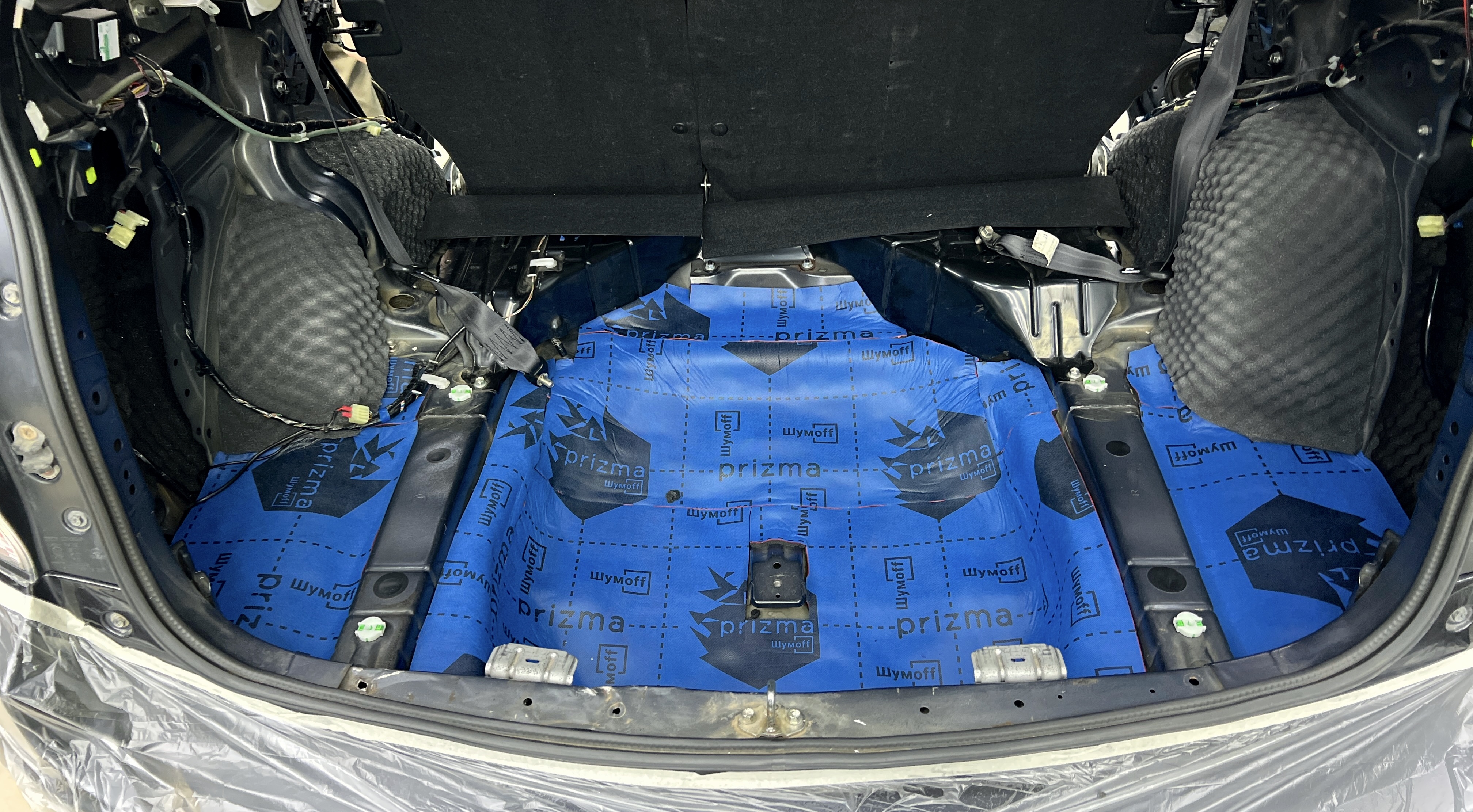 Обезжириваем поверхность и приступаем к монтажу второго слоя. Также для получения более эффективного результата используем компоновку из двух материалов На дно багажника клеим Шумофф Base 4. Этот слой позволит снизить нам шум от дороги.
