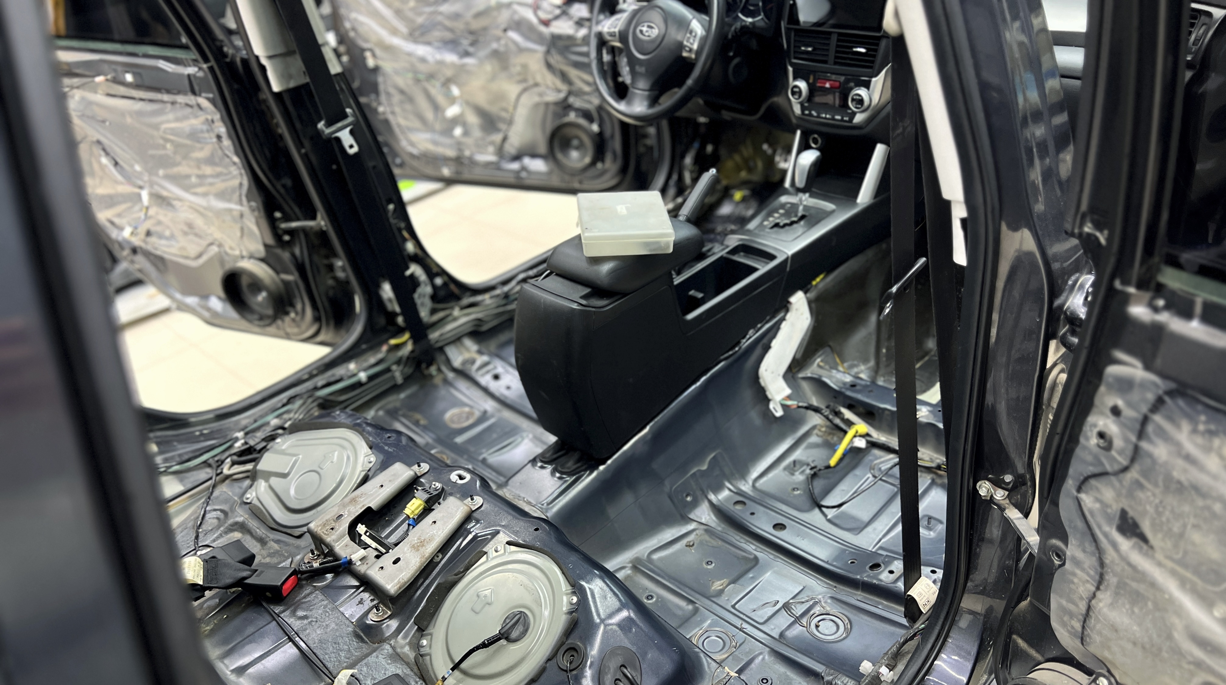 Шумоизоляция пола Субару Форестер Максимально вверх к моторной перегородке и до заднего сиденья клеим Шумофф Prizma 6.